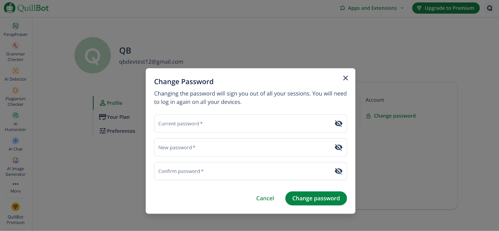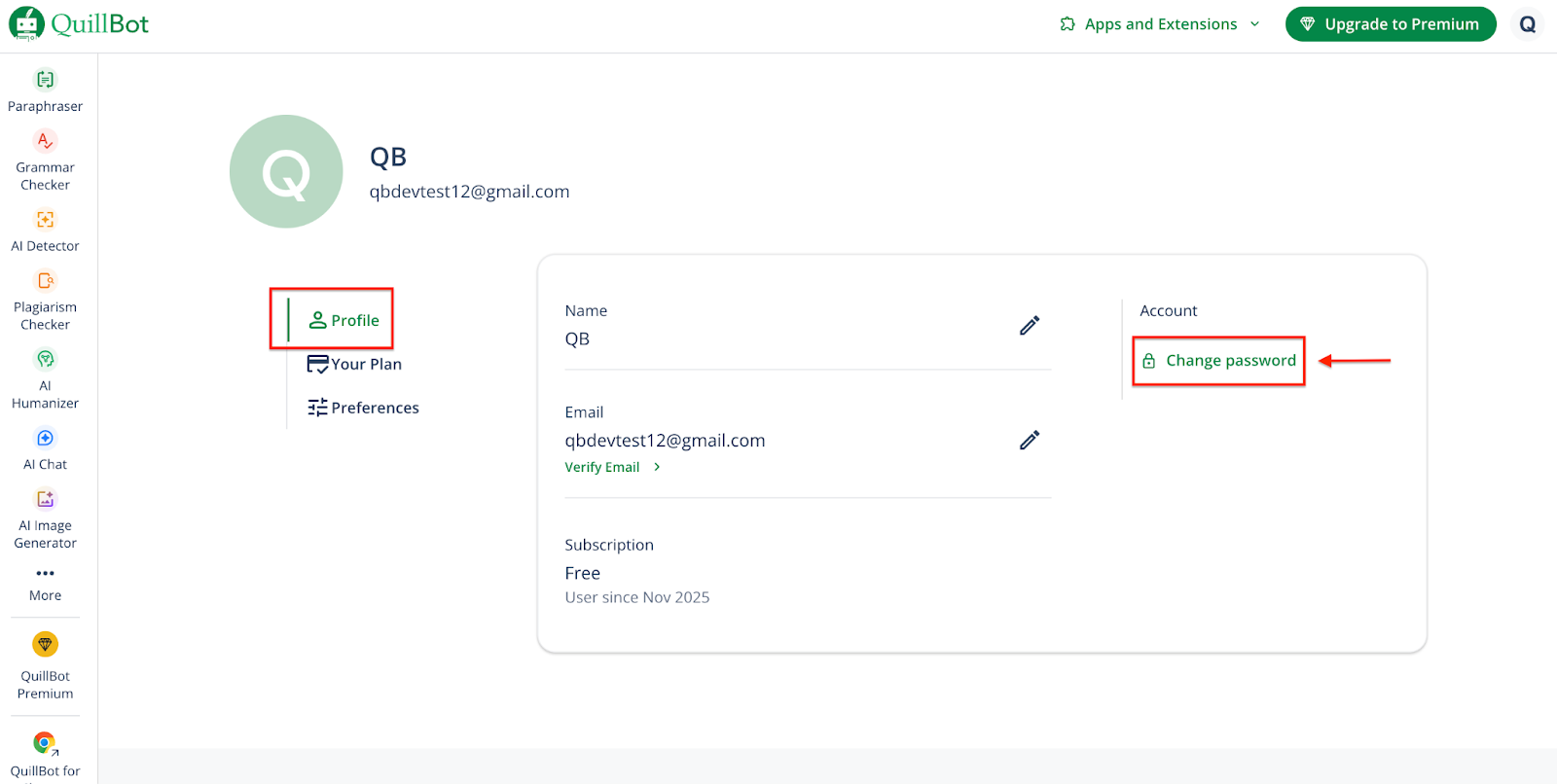 - Go to your Account page by clicking your profile icon (your initial) in the top-right corner of the QuillBot website and selecting Account Details.