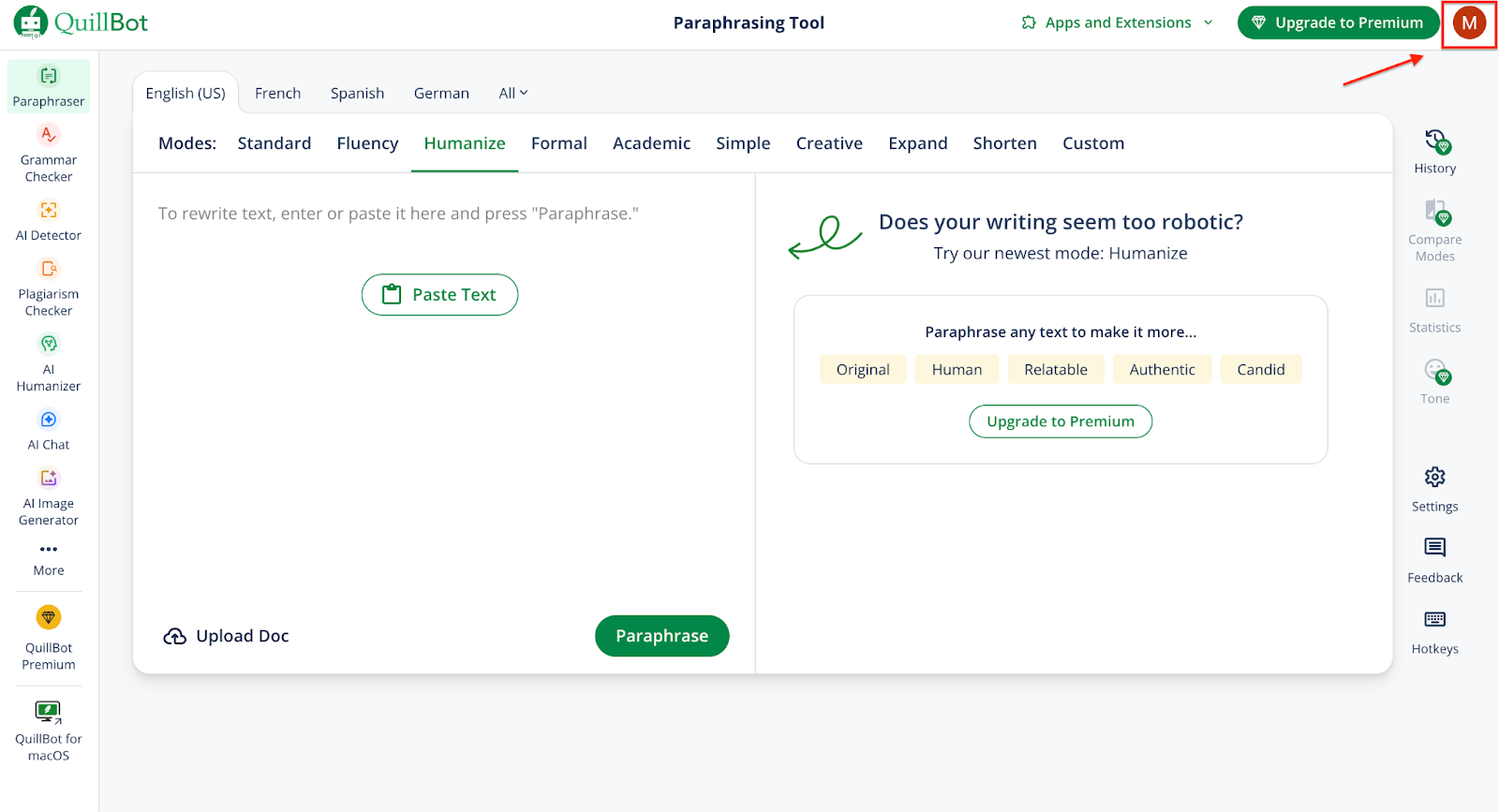 - Go to your Account page by clicking the profile icon (your initial) in the top-right corner of the QuillBot website and selecting Account Details.