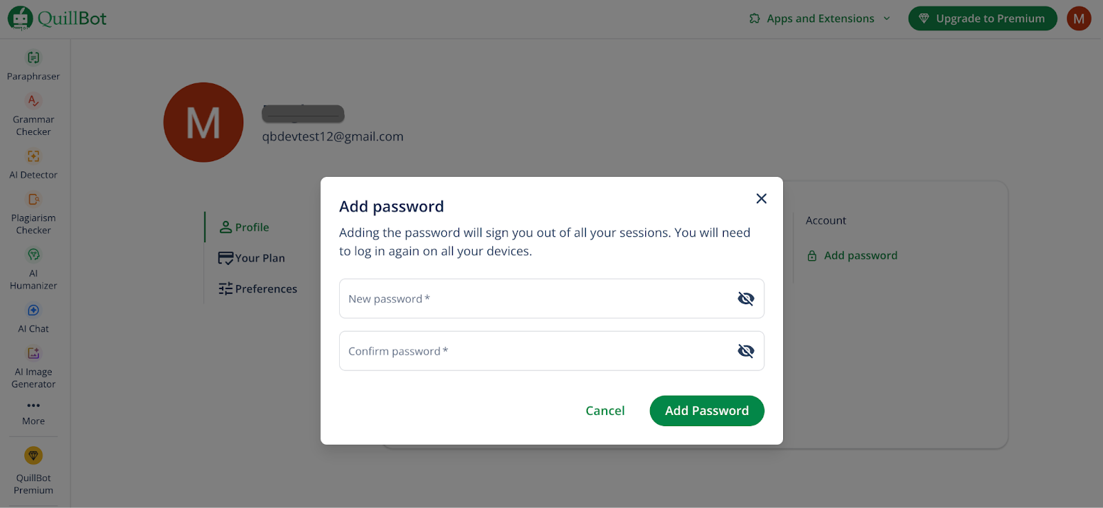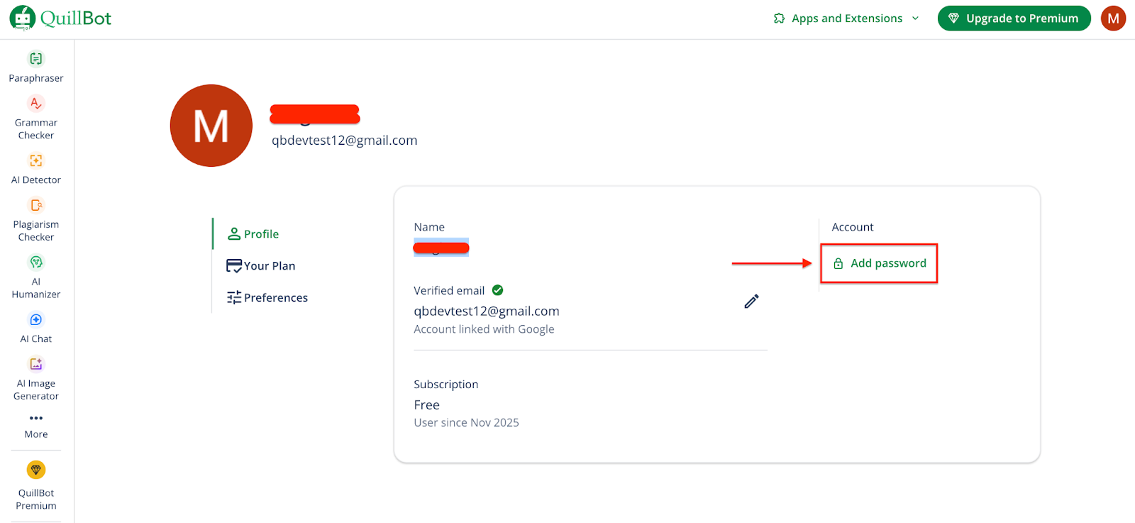 To unlink your Gmail account from QuillBot, you’ll need to add a password to your QuillBot account. This allows you to sign in directly using your email and password instead of Google Sign-In.