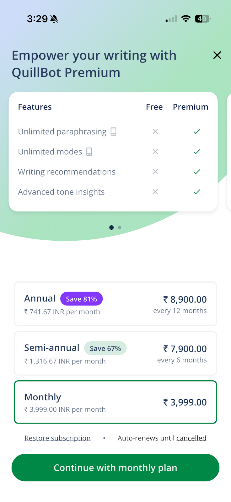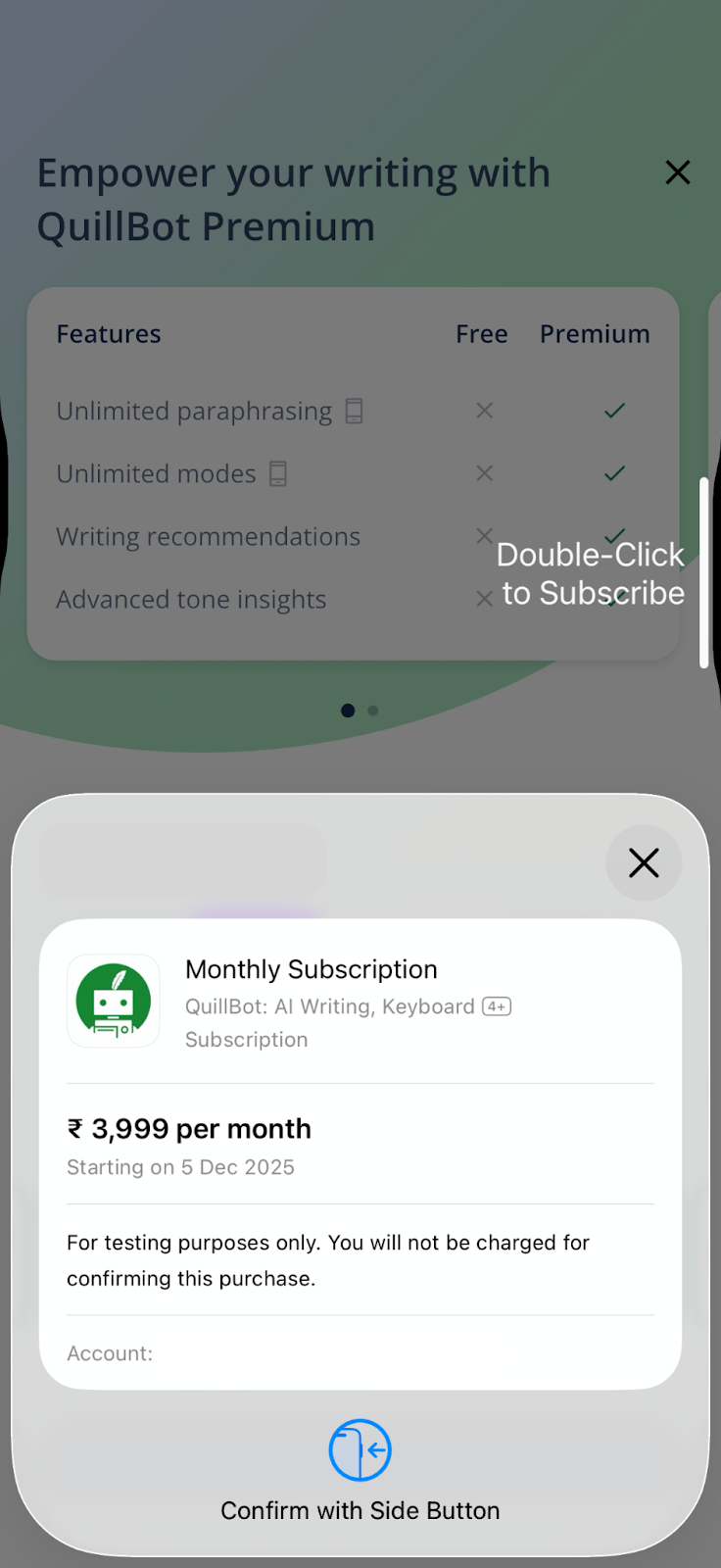 You can purchase a QuillBot Premium subscription directly through the QuillBot mobile app on your iPhone or iPad.