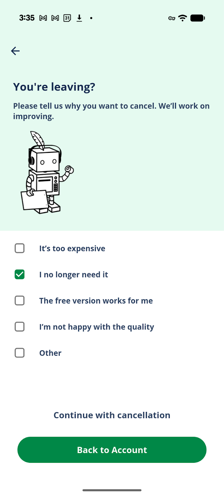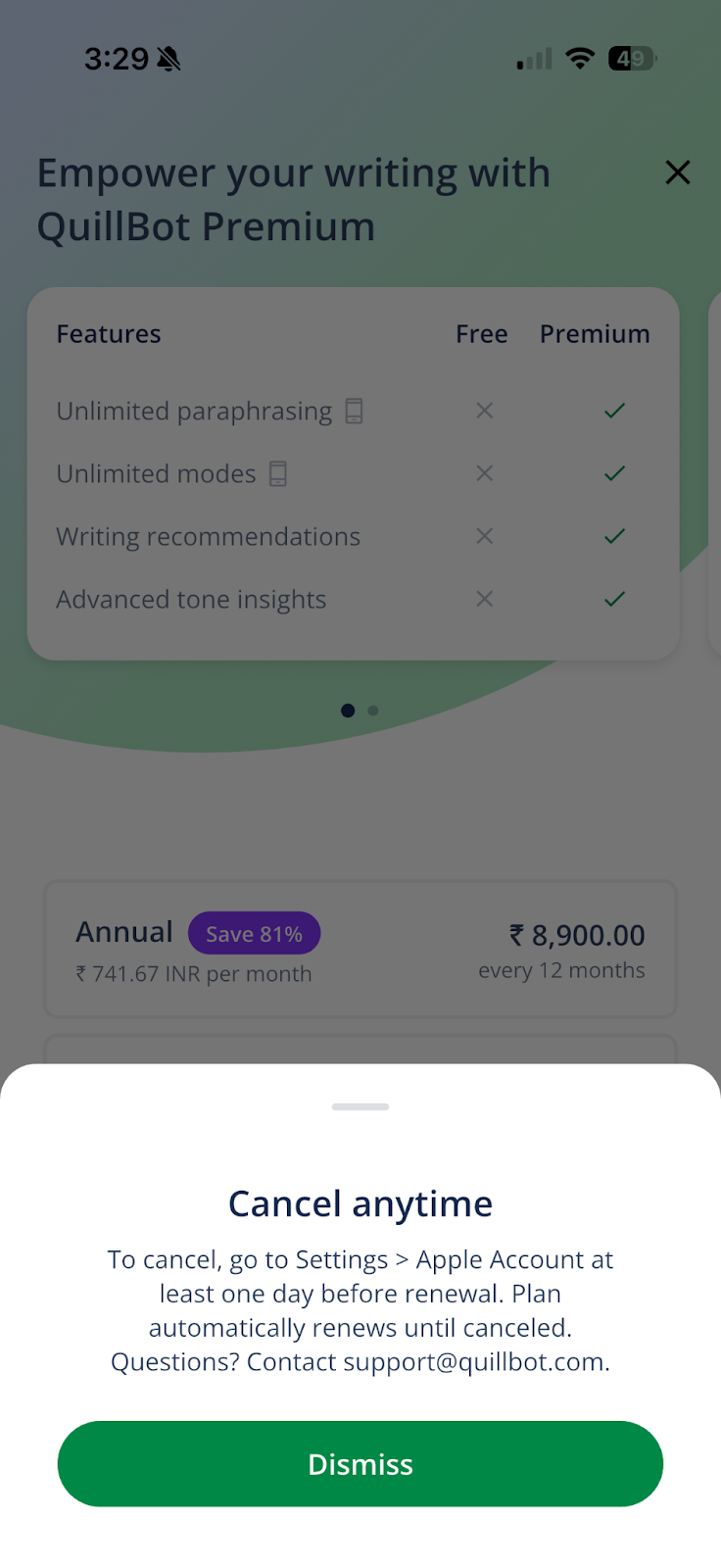 Yes, you can cancel your QuillBot subscription at any time if you purchased it through the Apple App Store (iOS) or Google Play Store (Android). Mobile subscriptions must be canceled directly through your device settings.