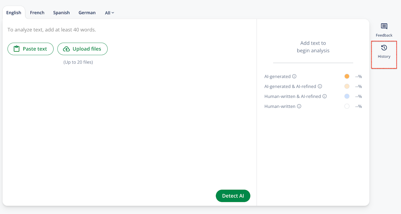 Yes! You can view your past AI detection results by clicking the clock icon located on the upper right side of the AI Detector interface. This opens your History, where previous scans and reports are saved for quick access.