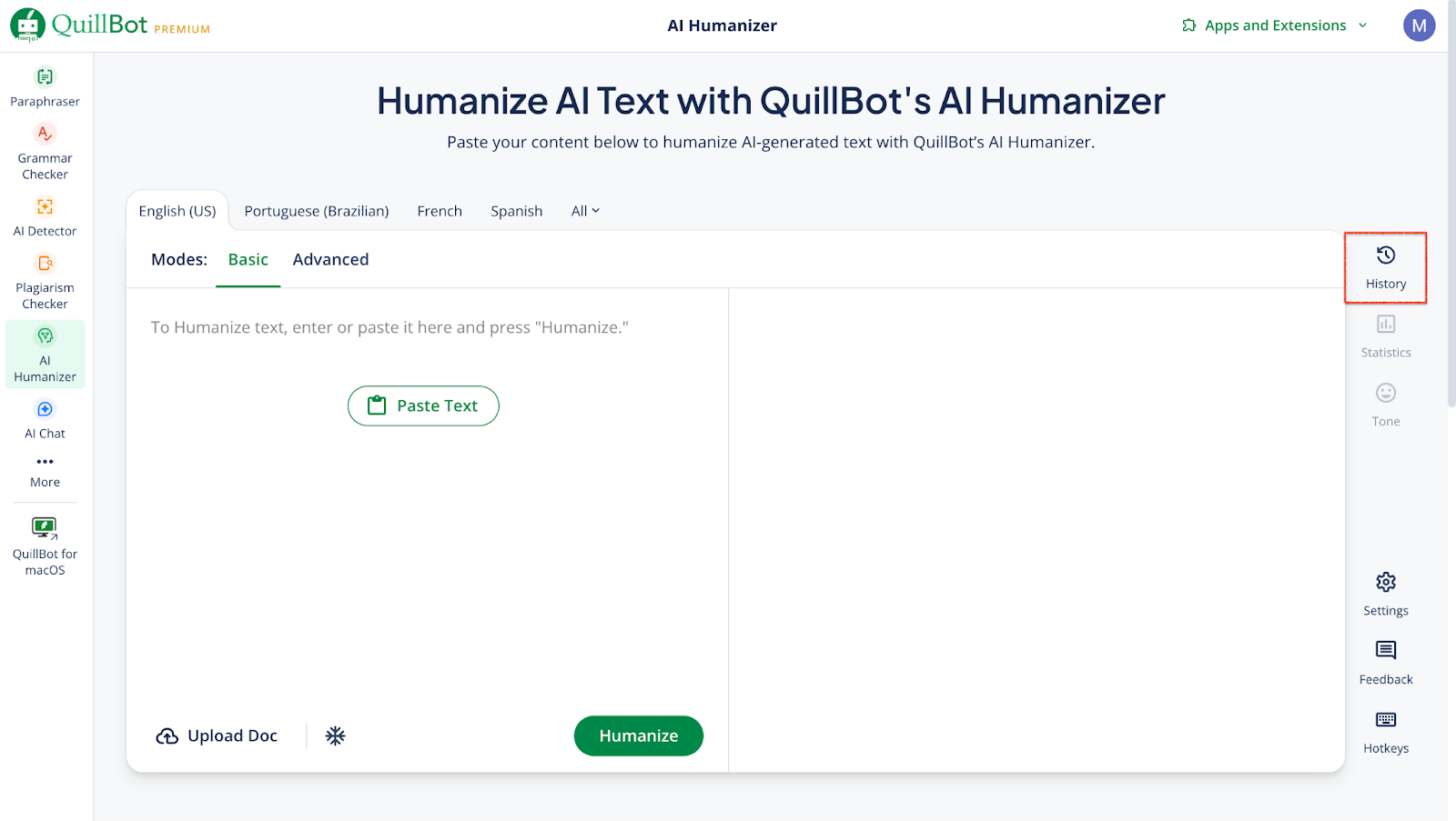 Yes! You can view your past Humanizer results by clicking on the clock icon on the upper right side of the AI Humanizer interface. This opens the History, where you can review and re-access your previously humanized content.