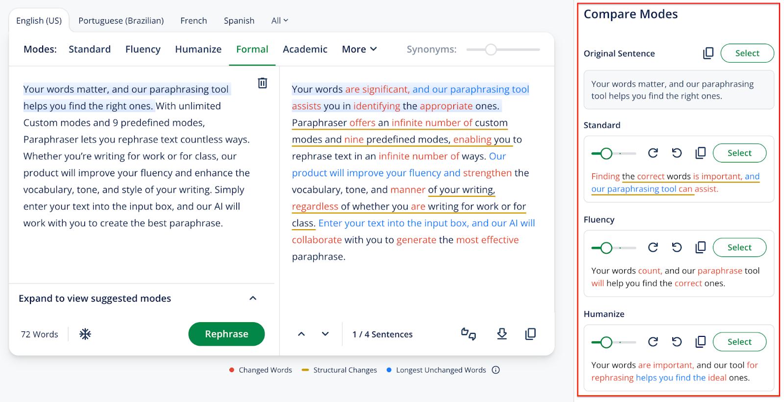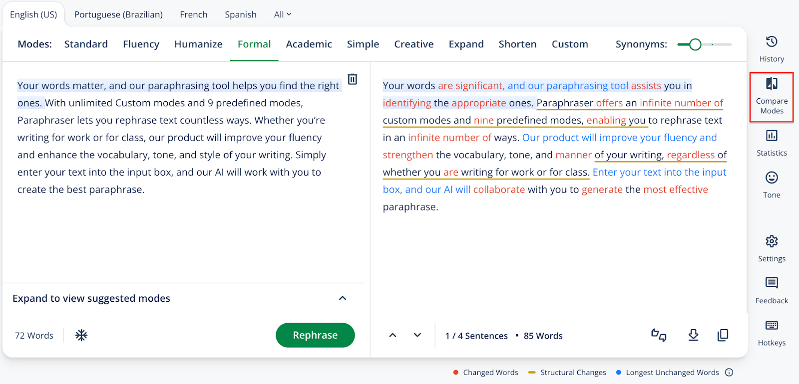 Compare Modes is a Premium feature that lets you see how the same sentence is paraphrased in all available modes. This makes it easy to compare results side by side and choose the version that best fits your needs.