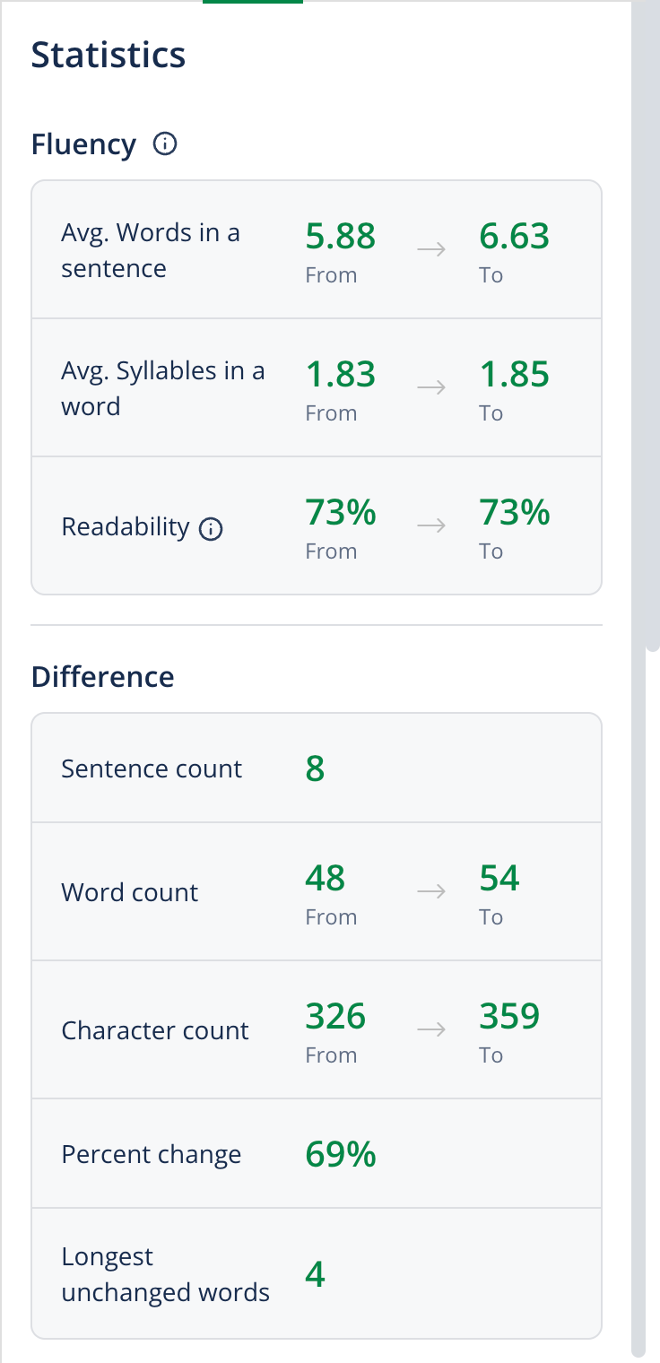 QuillBot’s Statistics feature gives you a quick overview of how much your text has changed after paraphrasing. It helps you understand the extent of rewriting and how it impacts readability. This feature is available in the Paraphraser and is shown automatically after you paraphrase your text.