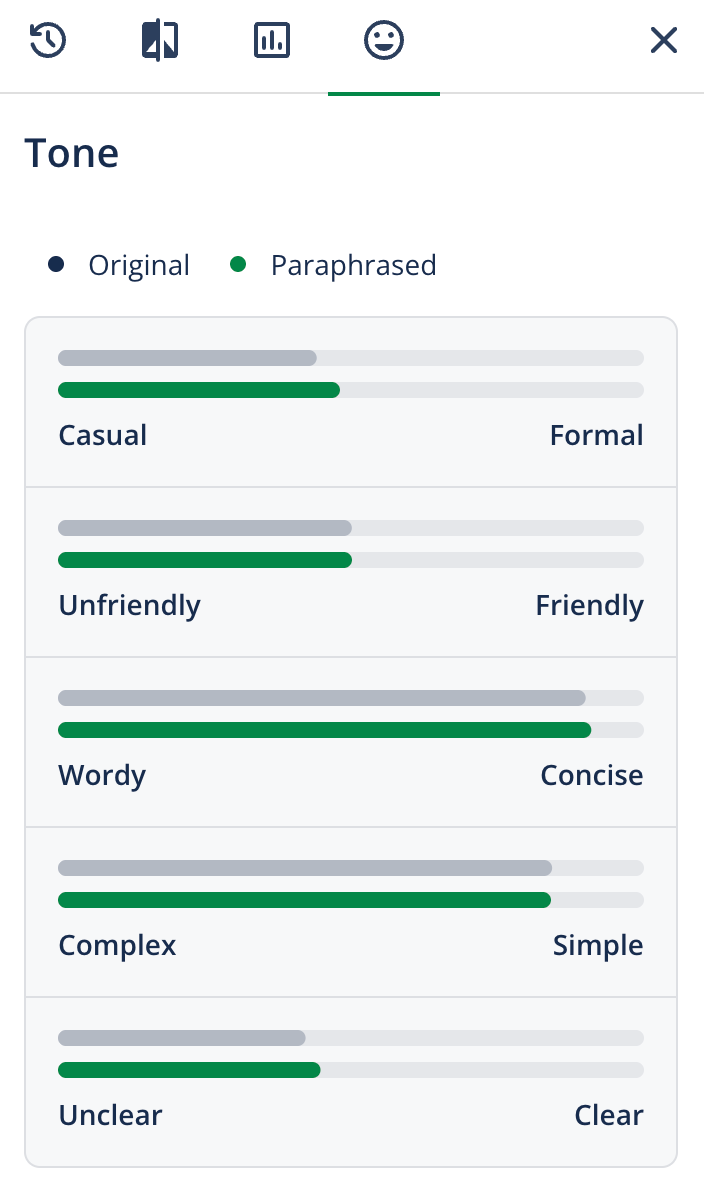 - Review the tone chart, which shows a comparison of your Original text (gray bar) and Paraphrased text (green bar).