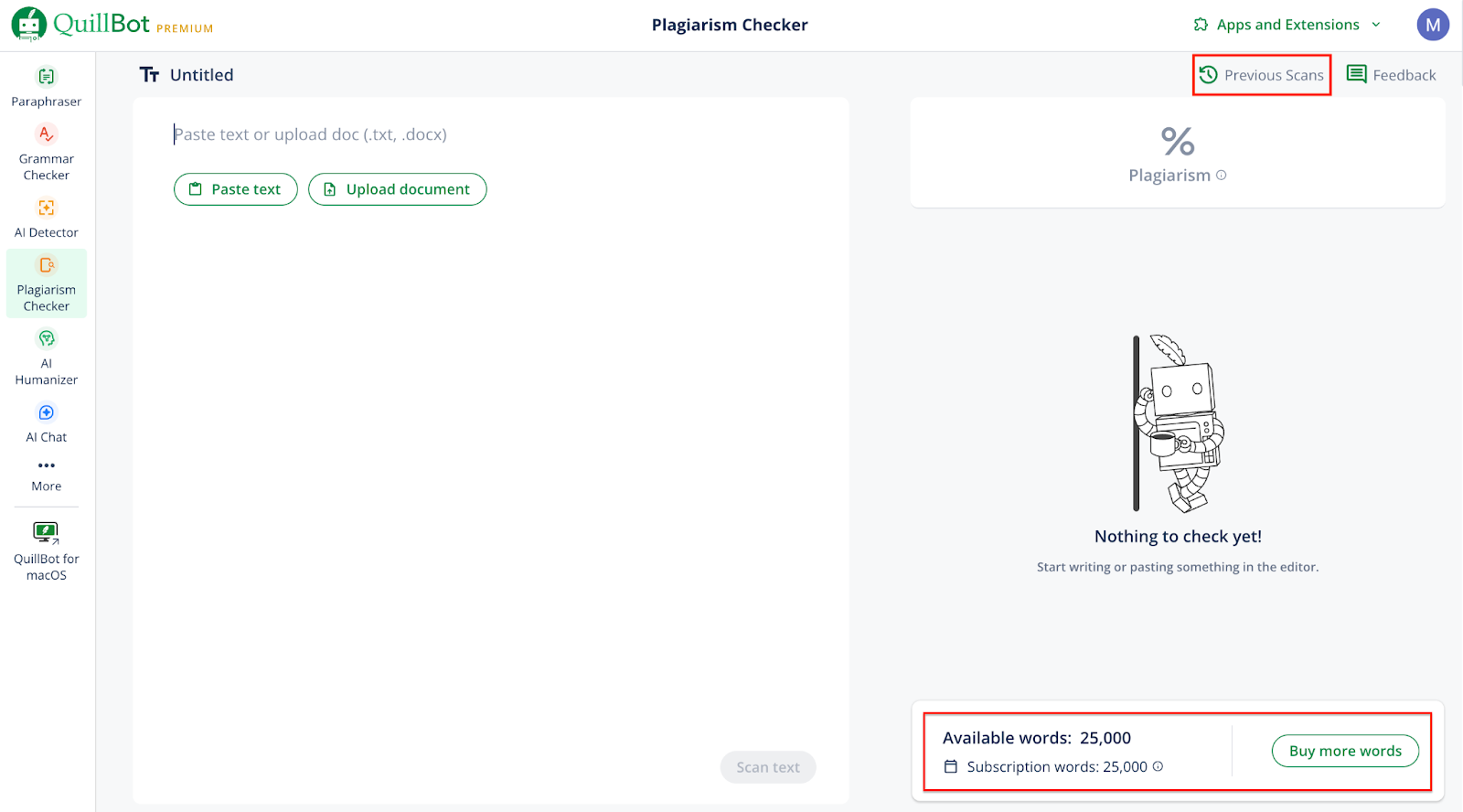 With a Premium account, you can track your word usage directly in the Plagiarism Checker. Premium users receive 25,000 words per month for plagiarism checks.