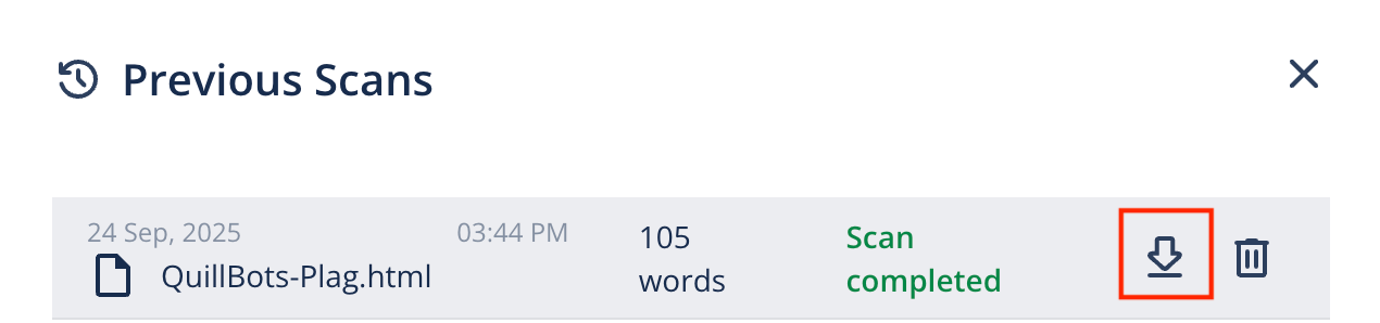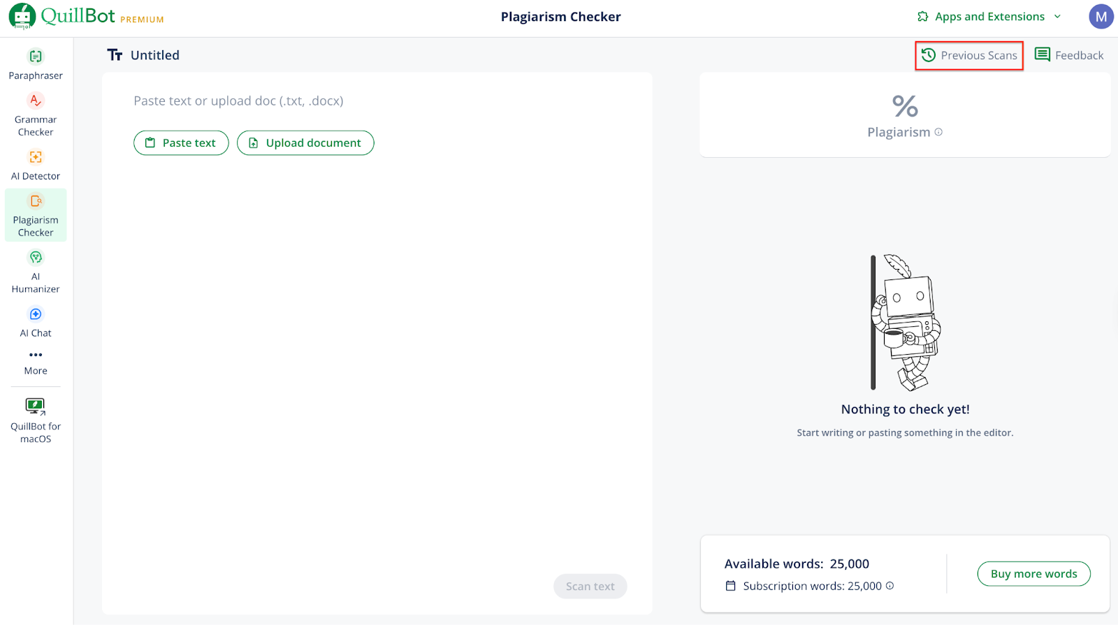 - Click Previous scans in the top-right corner of the Plagiarism Checker.