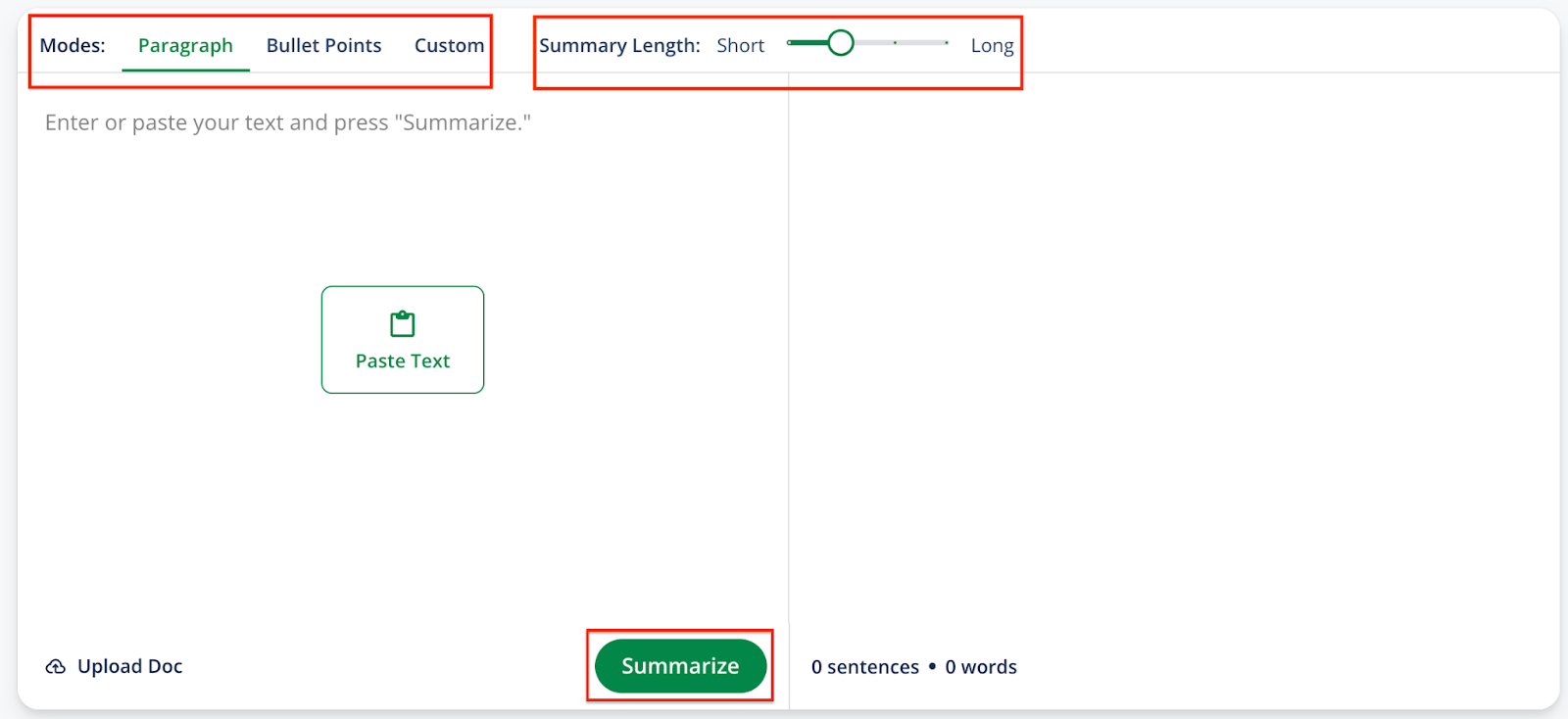 The tool will quickly create a shorter version of your text, highlighting the most important information in a clear format. You can also choose between Paragraph, Bullet Point, and Custom modes depending on your needs.