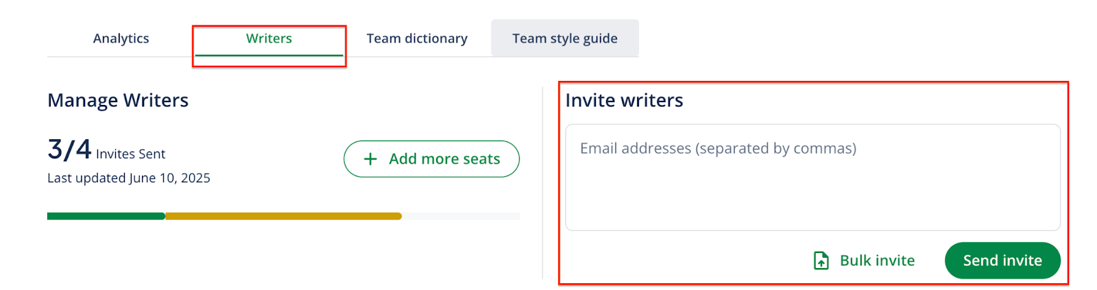 - Enter the email addresses of the writers you want to invite.