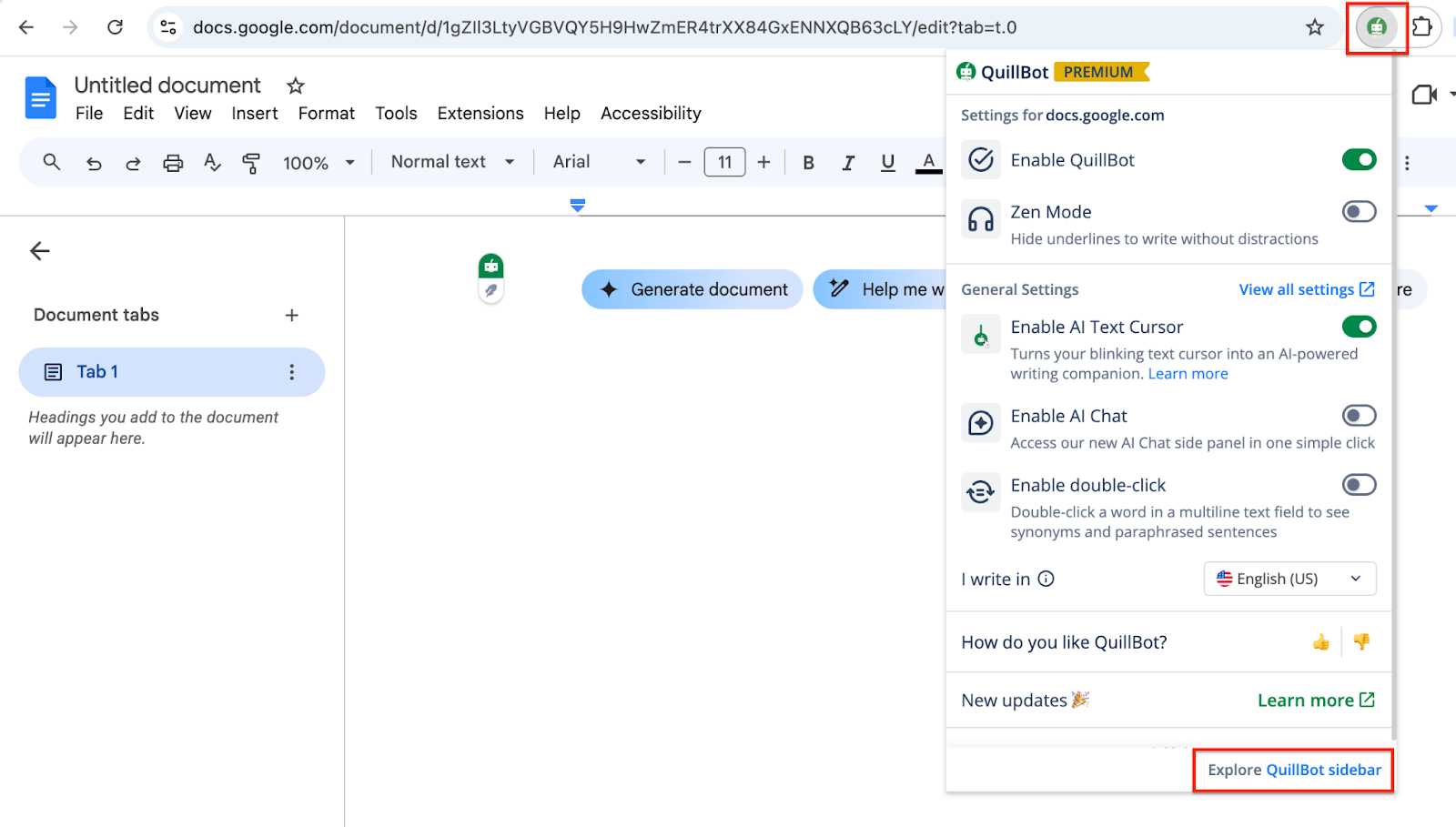 To open the QuillBot Sidebar in Google Docs: