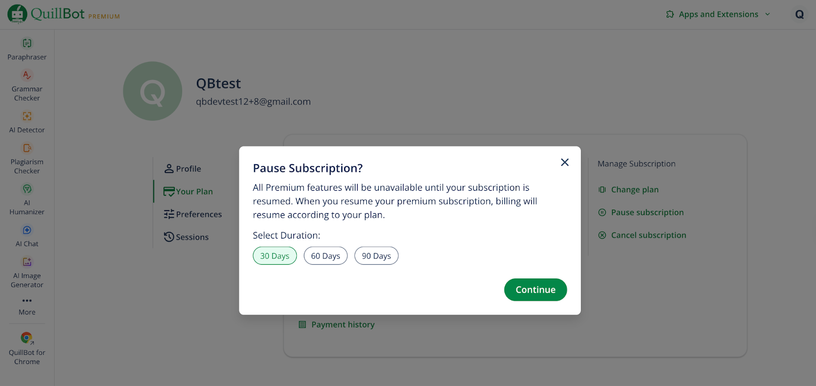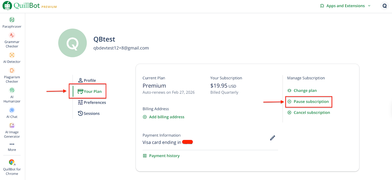 If you have a QuillBot Premium subscription but won’t be using it for a period of time, you can pause your subscription instead of canceling it. Pausing temporarily stops your billing, but it does not cancel your subscription.