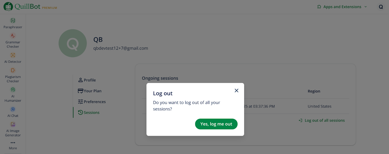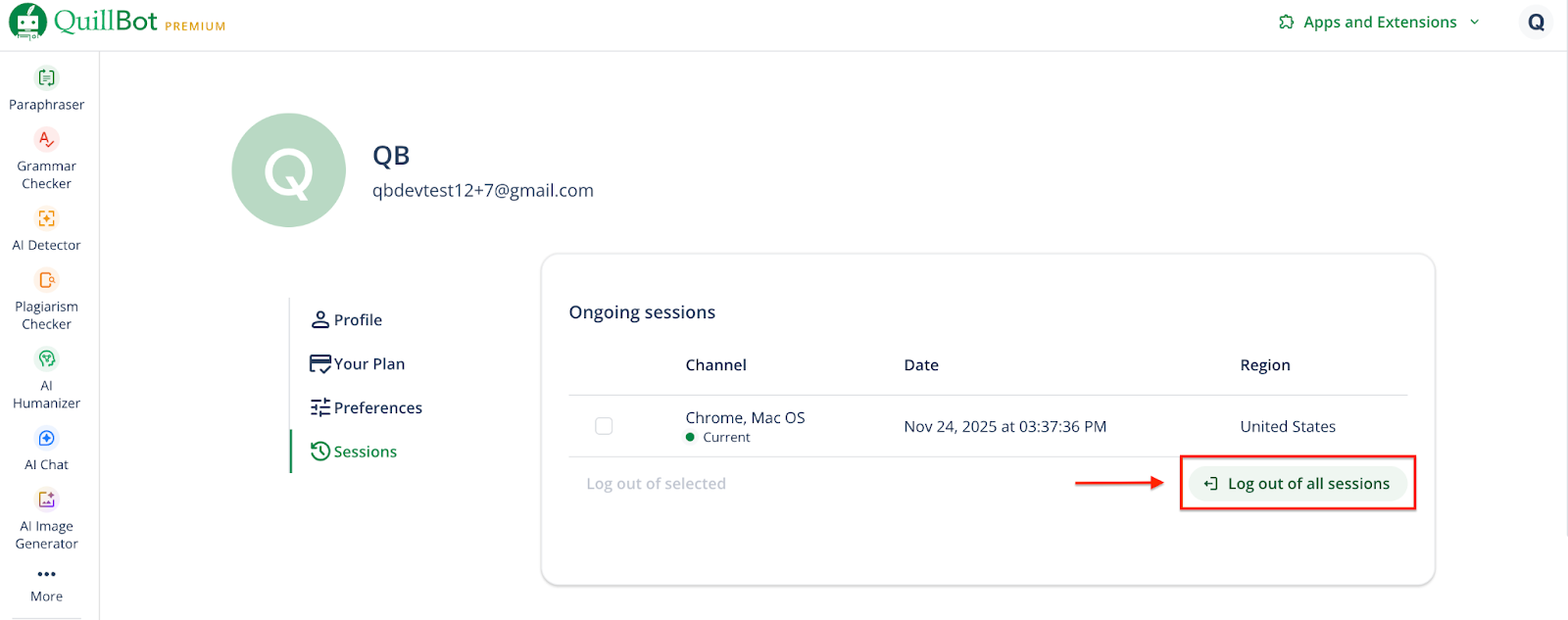 The Sessions tab helps you view and manage all active logins to your QuillBot account. Sessions are used to store and manage user data securely and improve account protection.